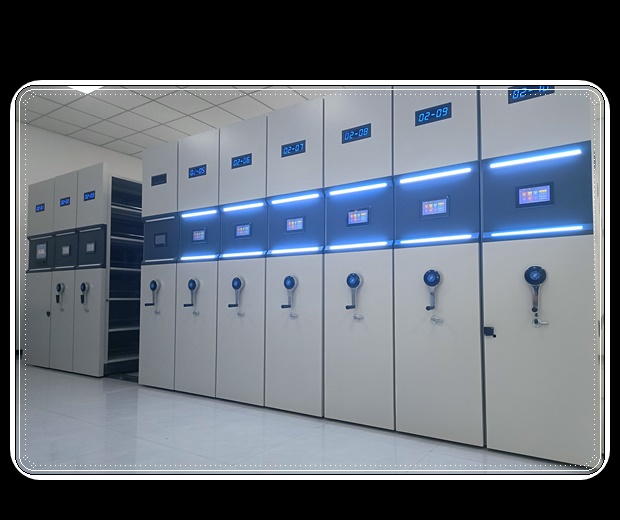 智能型檔案館密集柜是通過改造復(fù)柱式雙面固定柜,在其底座安裝軸輪,從而使之沿地面鋪設(shè)的小導(dǎo)軌直線移動(dòng),還可將多個(gè)柜子靠攏或分開,根據(jù)具體需要進(jìn)行組裝組合,是一種可移動(dòng)的密集型檔案裝具。