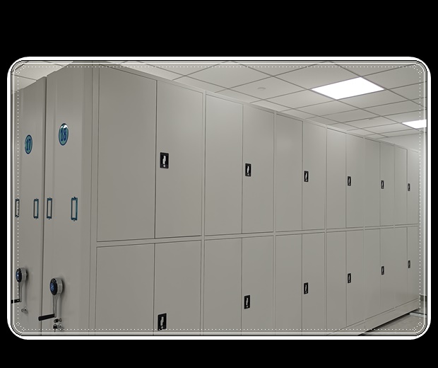 1、構(gòu)造:移動密集柜、固定柜為框柜鋼結(jié)構(gòu)。主要由20mm×20mm方鋼軌道、3.0mm底盤、1.5mm復(fù)柱立桿、1.0mm擱板、1.2mm側(cè)面板、1.0mm門板、旋動機構(gòu)、防震裝置、防倒裝置、制動裝置以及防塵、防鼠裝置等部分組成。